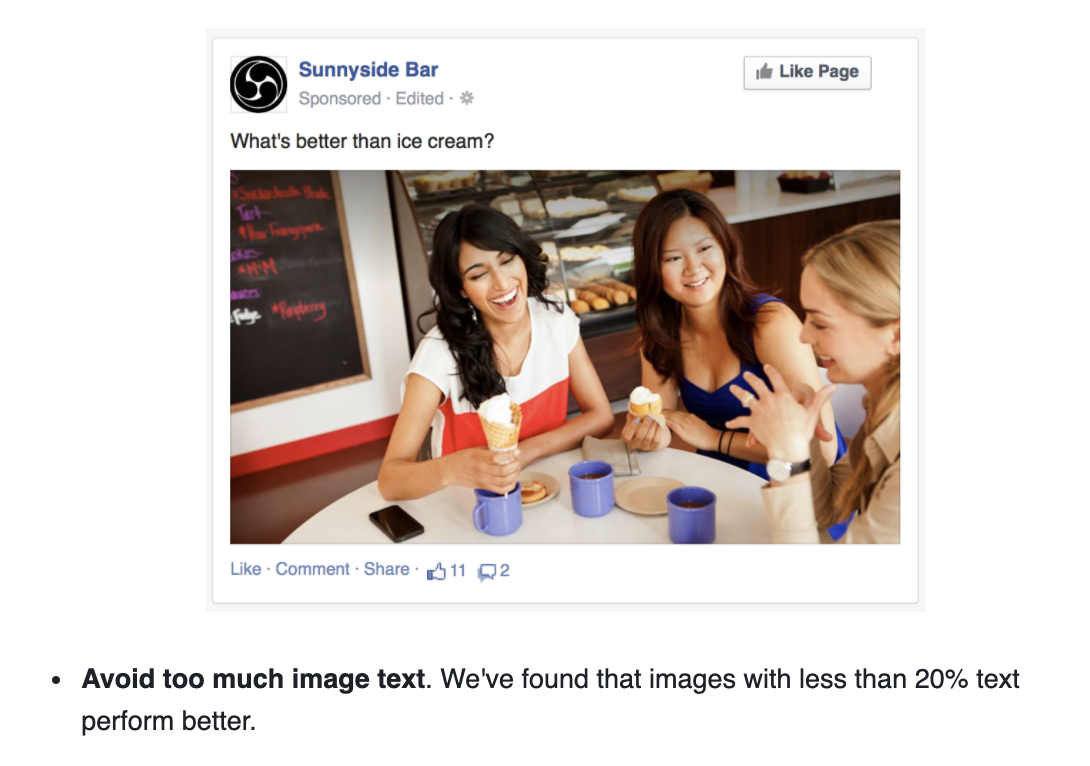 Như bạn có thể thấy, Facebook vẫn giữ nguyên quan điểm rằng, các ảnh quảng cáo có ít hơn 20% độ phủ văn bản sẽ hoạt động tốt hơn và họ khuyên các nhà quảng cáo hãy cứ “giữ cho văn bản thật ngắn gọn, rõ ràng và súc tích để truyền tải thông điệp một cách hiệu quả”.